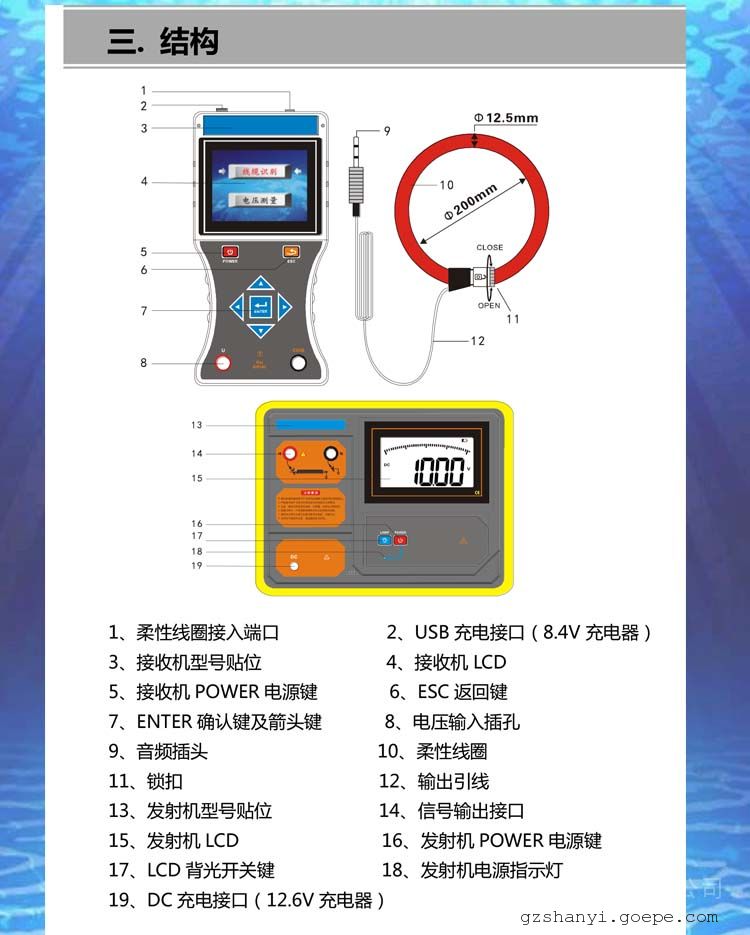 柔性电流钳为洛氏线圈,具有极佳的瞬态跟踪能力,能快速识别发射机产生的脉冲编码电流,适用于粗电缆或形状不规则的导体。其钳口内径为约200mm,可钳Φ200mm以下的电缆,不必断开被测线路,非接触测量,安全快速。