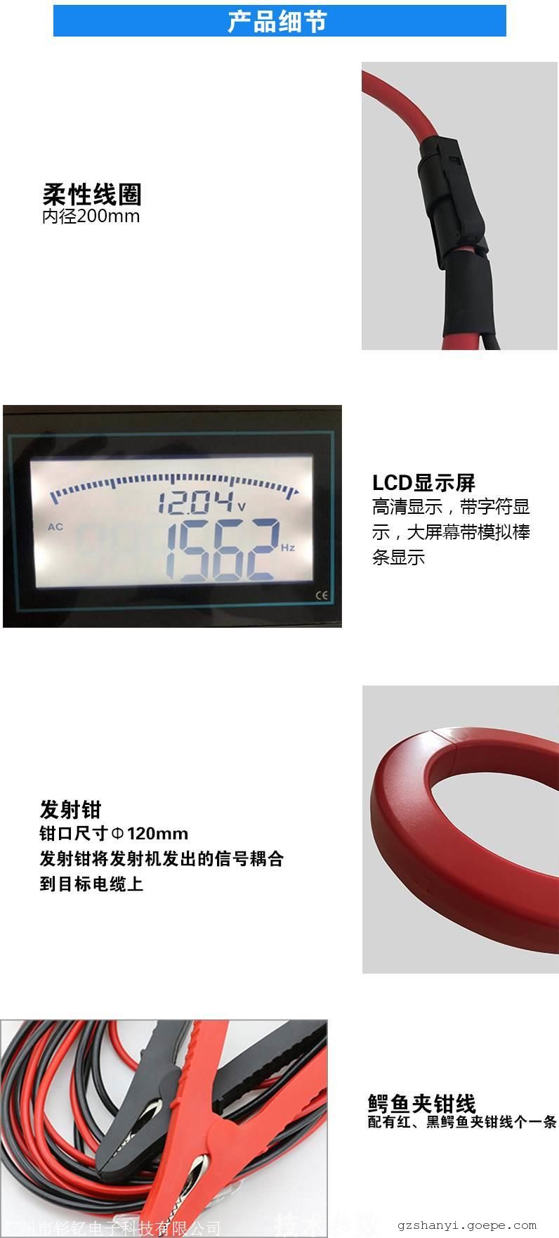 柔性电流钳:为洛氏线圈,具有极佳的瞬态跟踪能力,能快速识别发射机产生的脉冲编码电流,适用于粗电缆或形状不规则的导体。其钳口内径为约200mm,可钳Φ200mm以下的电缆,不必断开被测线路,非接触测量,安全快速。