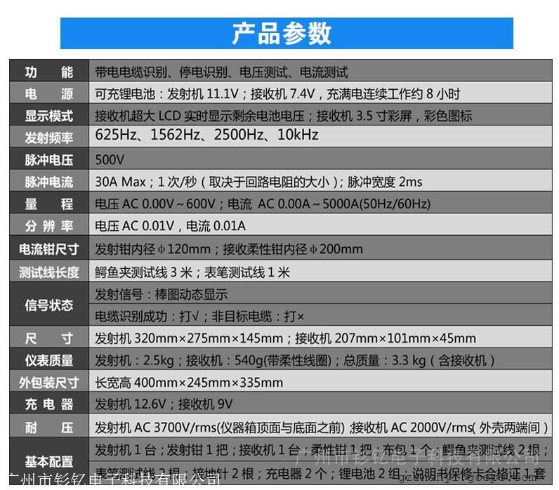 接收机:为手持设备,3.5寸彩色液晶屏,内置高速微处理器,结合精准算法,对发射机的脉冲编码电流信号进行识别并解码,同时具有信号强度标定功能,显示信号强度和检测结果,精美直观;彩色刻度条动态显示,一目了然,电缆识别成功打√,非目标电缆打×,能快速自动识别目标电缆。同时可测试电压量程为AC 0.00V~600V(50Hz/60Hz),可测交流电流量程为AC 0.00A~5000A(50Hz/60Hz),可测电流频率45Hz~70Hz。