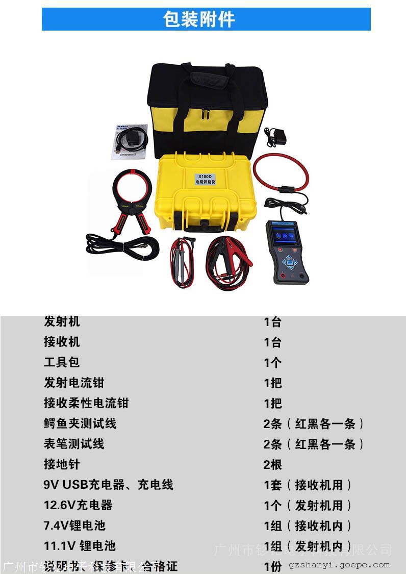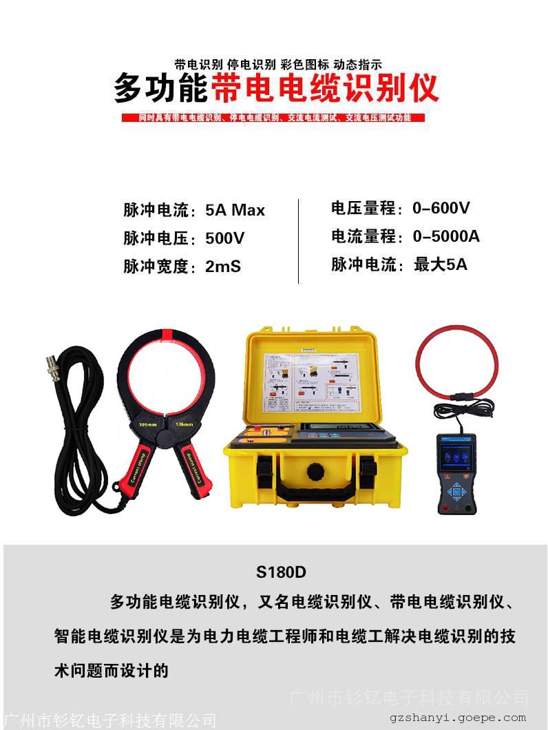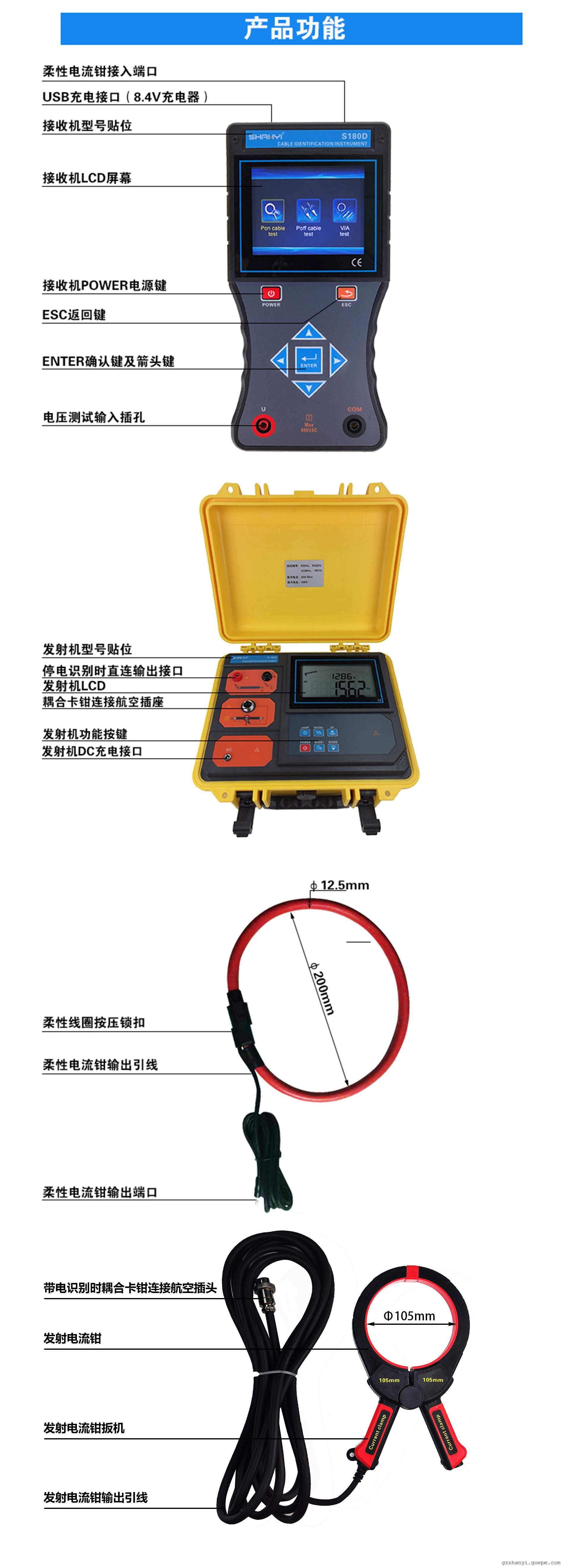 S180D多功能电缆识别仪,又名电缆识别仪、带电电缆识别仪、智能电缆识别仪是为电力电缆工程师和电缆工解决电缆识别的技术问题而设计的。用户通过仪器从多根电缆中准确识别出其中某一根目标电缆,避免误锯带电电缆而引发严重事故。电缆识别是从电缆两端的操作开始的,必须保证电缆两端的双重编号准确无误,本仪器设计采用了PSK技术,结合精准算法。本产品同时具有带电电缆识别、停电电缆识别、交流电流测试、交流电压测试功能,由发射机、发射电流钳、接收机、接收柔性电流钳等组成。