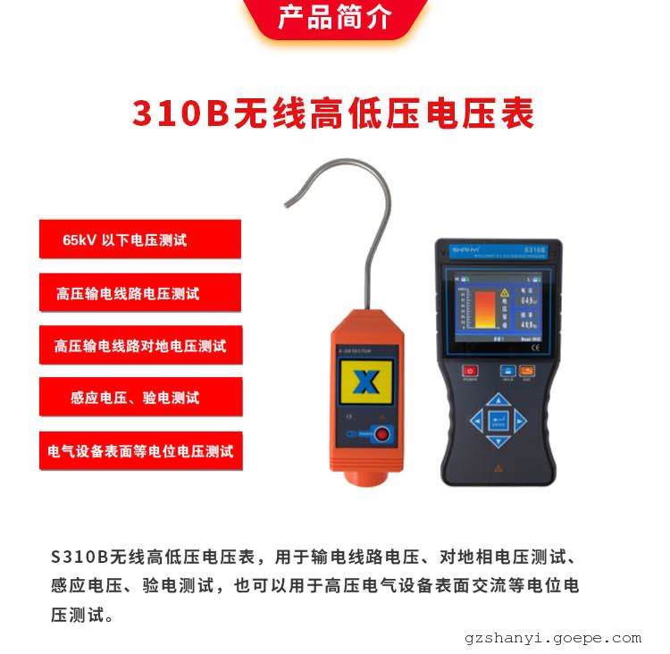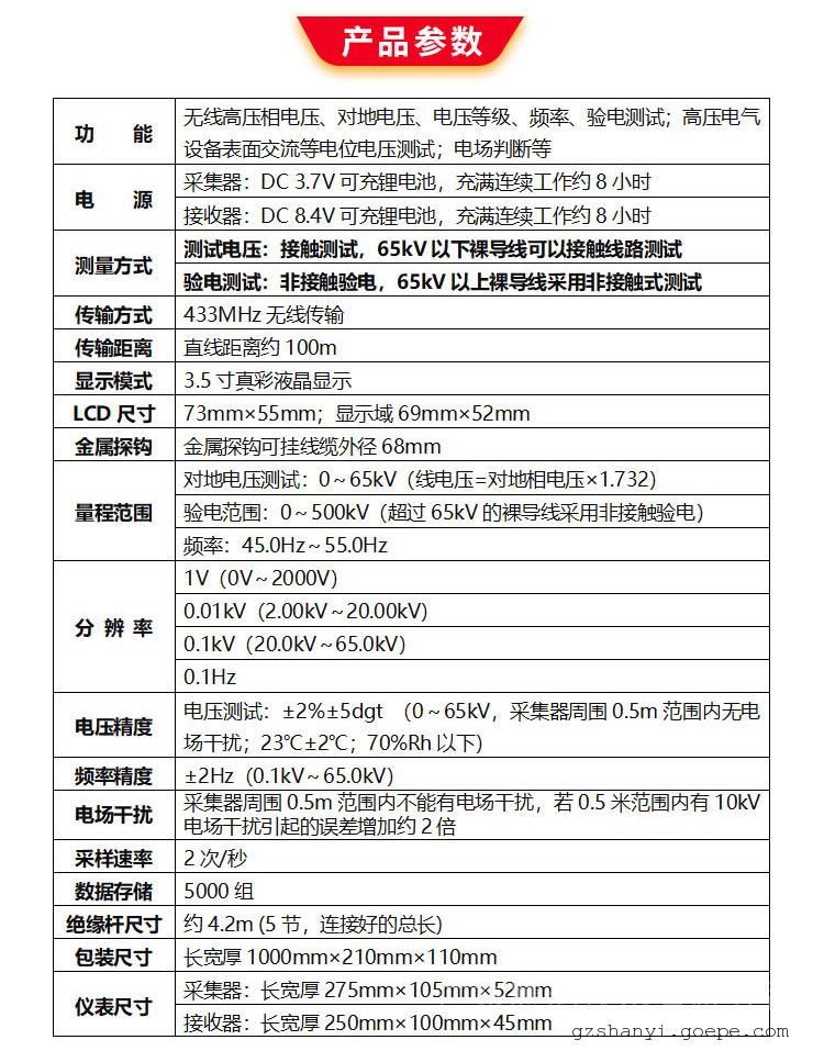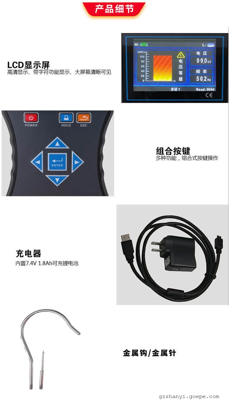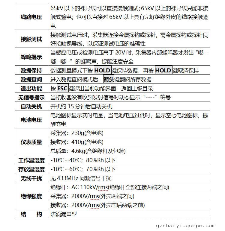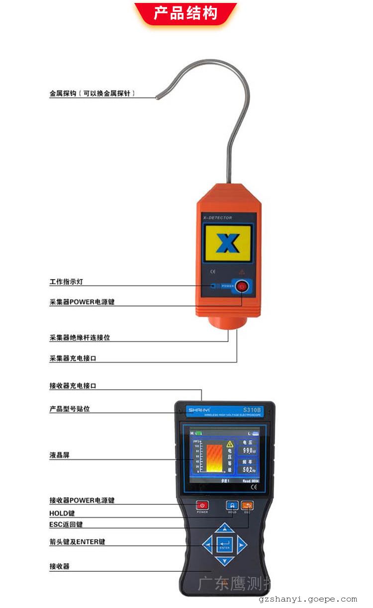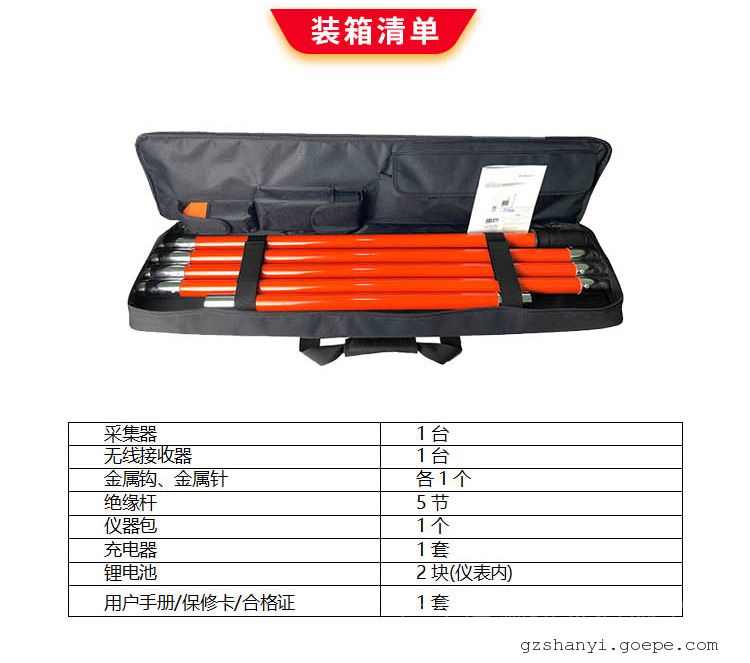 采集器前端可以连接金属探钩或探针,用于直接接触测试65kV以下的裸导线电压或验电,连接金属探针,还可以对二次带电指示器的验电孔进行验电。当采集器接触带电导线,不管是零线、火线、地线、高压输电线路或金属导体,只要有电场,可能是直接输送的电,也可能是绝缘破损引起的漏电,或电缆交叉互感带电,采集器都能感应到它的电磁场,并发出“嘟--嘟--嘟--”的蜂鸣声。接收器采用3.5寸真彩液晶屏,同屏动态显示电压等级、电压值、频率,清晰直观,无线接收直线距离约100米。绝缘杆具有防潮、耐高温、抗冲击、高绝缘、抗弯曲等特点。仪器广泛应用于变电站、发电站、铁路部门、消防部分、工矿企业以及监测站、电工维修部门进行高压电压测试和野外电动作业等。